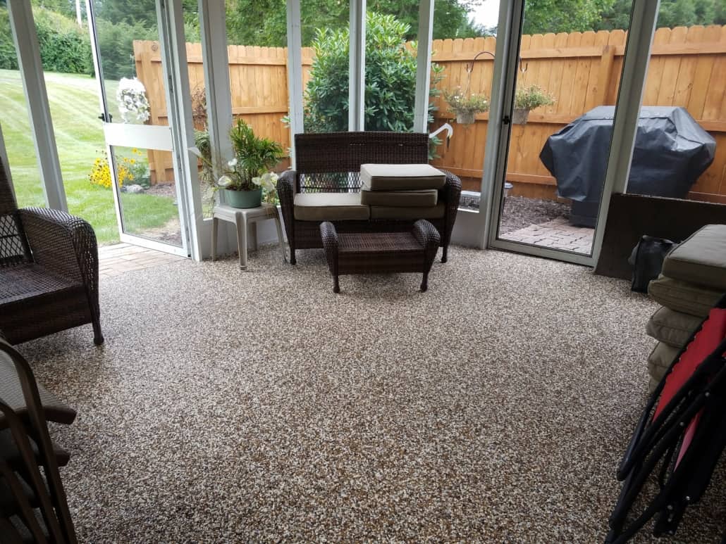 If you’ve thought of epoxy stone flooring as used only for sidewalk and patio coverings, think again!